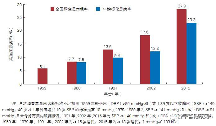 從1959年到2015年,高血壓患病率快速上升,至2015年全國調(diào)查患病率粗率已達27.9%,這意味著每四個成人至少有一個有高血壓。