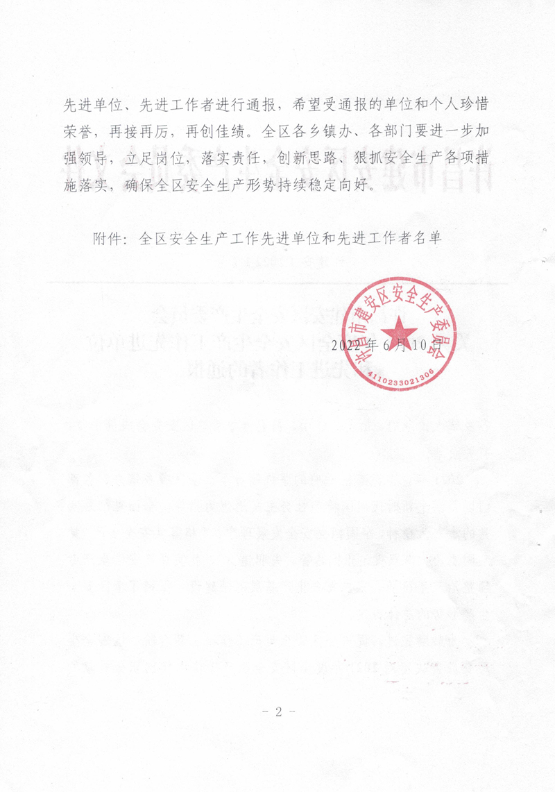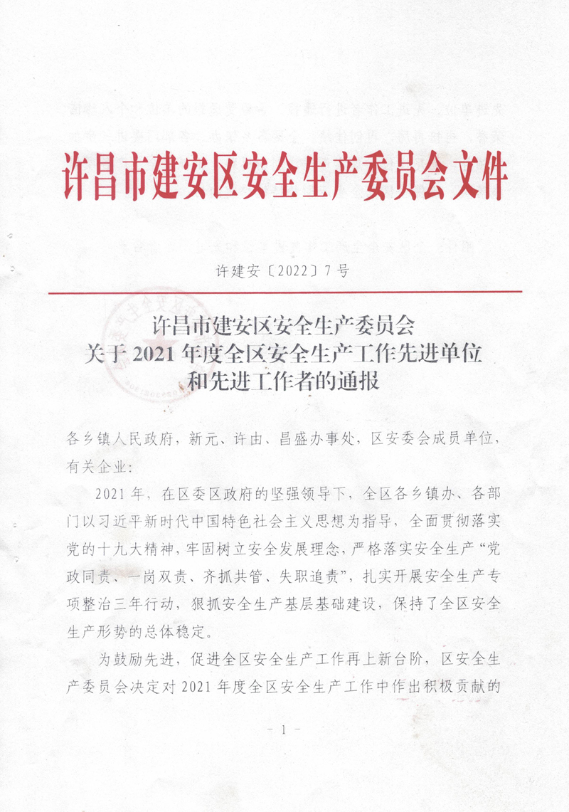2021年,我公司以習(xí)近平新時(shí)代中國(guó)特色社會(huì)主義思想為指導(dǎo),全面貫徹落實(shí)黨的十九大精神,牢固樹(shù)立安全發(fā)展理念,嚴(yán)格落實(shí)安全生產(chǎn)“黨政同責(zé)、一崗雙責(zé)、齊抓共管、失職追責(zé)”,狠抓安全生產(chǎn)基層基礎(chǔ)建設(shè),排除潛在的安全隱患,保持了廠區(qū)安全生產(chǎn)形勢(shì)的總體穩(wěn)定。故許昌市建安區(qū)安全生產(chǎn)委員會(huì)對(duì)我公司在2021年度安全生產(chǎn)工作中的積極貢獻(xiàn)進(jìn)行了表彰,授予于“全區(qū)安全生產(chǎn)工作先進(jìn)單位”稱號(hào)。